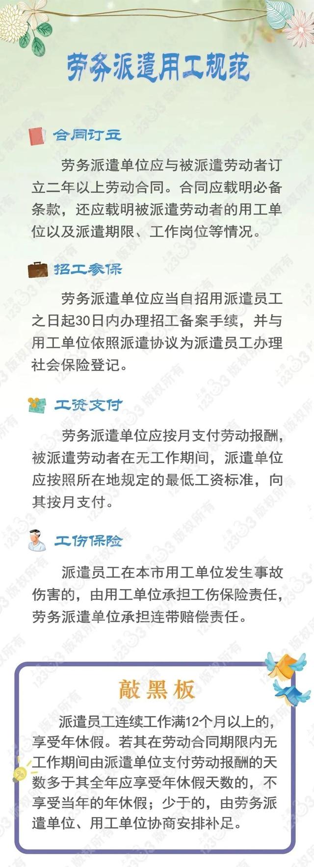 你知道劳务派遣用工的规范有哪些吗?市人社局说,劳务派遣单位应与被派遣劳动者订立2年以上的劳动合同,应按月支付劳动报酬。派遣员工连续工作满12个月以上的,可享受年休假。详见↓